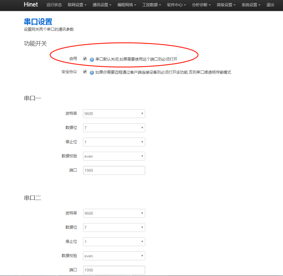 1. 網(wǎng)關(guān)串口功能是否開啟,進(jìn)網(wǎng)關(guān)后臺,點擊“通訊設(shè)置 - 串口設(shè)置”,串口勾選【啟用】。