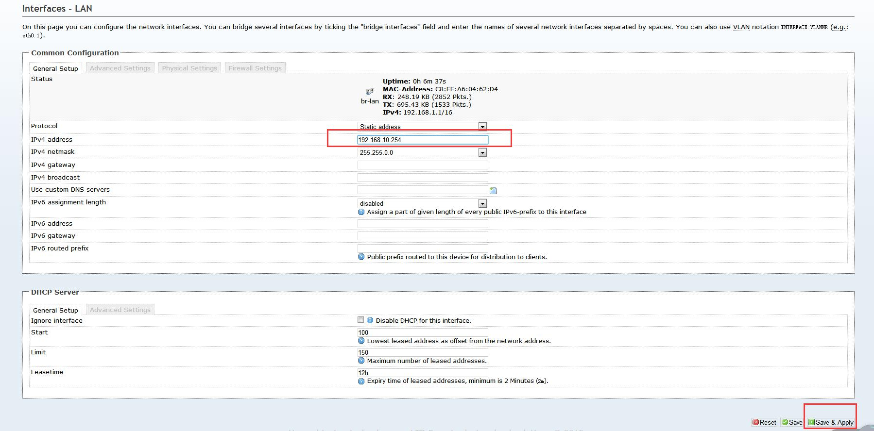3.7 修改 IP 為 192.168.10.254 并點擊“Save&Apply”。(其他配置均不需要改變)