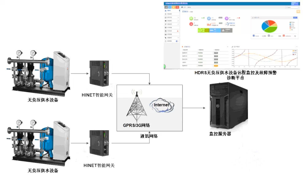 HDRS無(wú)負(fù)壓供水監(jiān)控預(yù)警系統(tǒng)由HINET智能網(wǎng)關(guān)、HDRS遠(yuǎn)程通信密鑰及HDRS供水監(jiān)控預(yù)警平臺(tái)組成。HINET智能網(wǎng)關(guān)作為HDRS供水監(jiān)控預(yù)警系統(tǒng)的數(shù)據(jù)采集端與變頻控制器中的核心控制器(如PLC)連接,將采集到的數(shù)據(jù)通過(guò)GPRS/3G/以太網(wǎng)等方式上傳至監(jiān)控服務(wù)器中,并通過(guò)HDRS無(wú)負(fù)壓供水監(jiān)控預(yù)警平臺(tái)強(qiáng)大的數(shù)據(jù)處理能力實(shí)現(xiàn)對(duì)無(wú)負(fù)壓供水設(shè)備的壓力、倒流、過(guò)流、變頻故障等信息的實(shí)時(shí)監(jiān)測(cè),同時(shí)實(shí)現(xiàn)超流量報(bào)警、進(jìn)壓過(guò)壓報(bào)警等報(bào)警動(dòng)作,并通過(guò)手機(jī)短信或郵件等方式通知設(shè)備管理員。